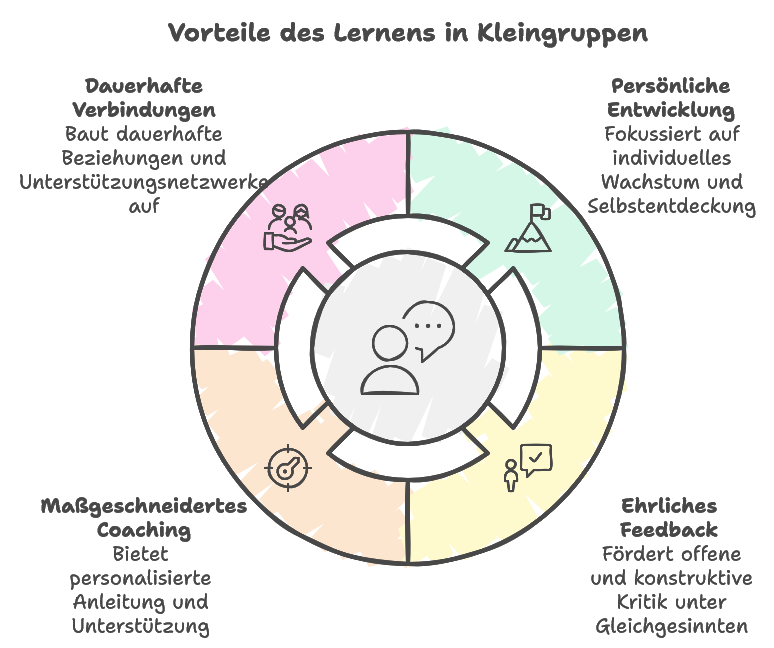 Die vertraute Atmosphäre in der Kleingruppe ermöglicht es dir, dich verletzlicher zu zeigen und ehrliches, wertschätzendes Feedback zu deinen Fortschritten zu erhalten. Nur so kannst du wirklich an deinen Themen arbeiten und dich nachhaltig weiterentwickeln.
